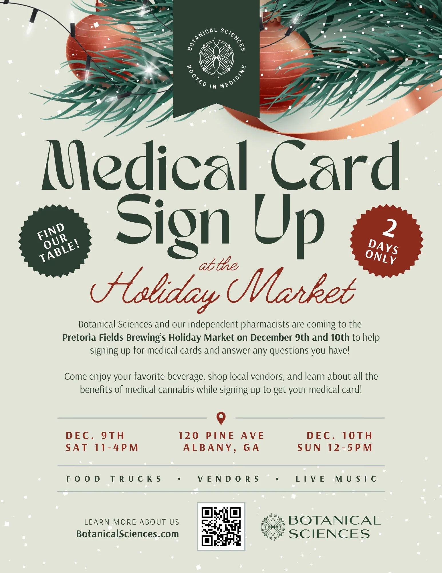 Botanical Sciences and their independent pharmacists are coming to the Pretoria Fields Brewing's Holiday Market on December 9th and 10th to help in signing up for medical cards and answer any questions you have!