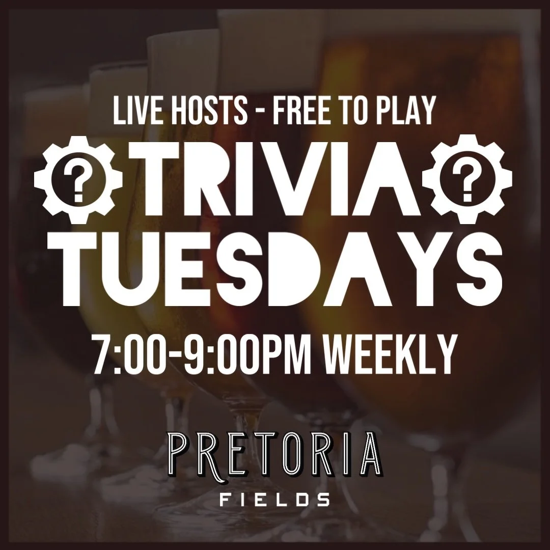 Trivia Tuesday Tuesday, June 7, 2022 7:00 PM 9:00 PM Pretoria Fields Taproom 120 Pine Avenue Albany, GA, 31701 United States (map) Google Calendar ICS Come out for weekly trivia on Trivia Tuesdays! Bring your crew and win some prizes! Want to study up before? Keep an eye on our Facebook & Instagram stories for categories each week! ALWAYS LIVE HOSTED & FREE TO PLAY!
